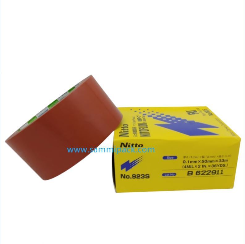 Nitto Tape No.923Sは、オレンジ色の特殊配向ポリテトラフルオロエチレン(PTFE)フィルムを基材としたテープです。片面に処理を施し、高い耐熱性を持つシリコーン系粘着剤を塗布しています。電気特性、耐熱性、耐薬品性、非粘着性などの優れた特徴を備えています。